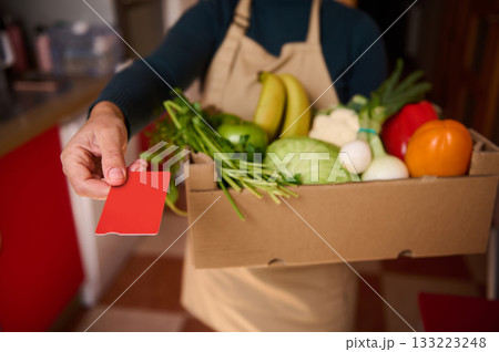 Delivery Person Holding Red Card With Box Of Fresh Vegetables For Grocery Service