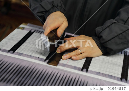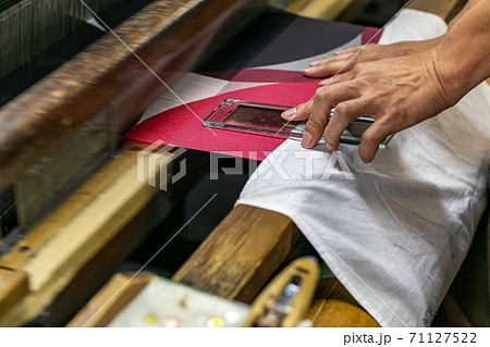 日本の伝統工芸、着物を作る機織り機と機織り職人