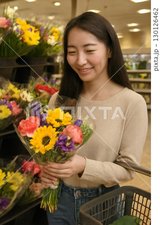 スーパーの花売り場で花束を選ぶ場面を生成