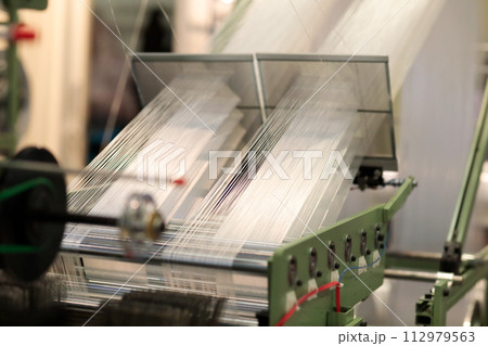 Automated looms weave colorful yarns into fabrics at this efficient textile mill. Manufacturing is in full swing