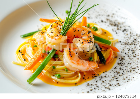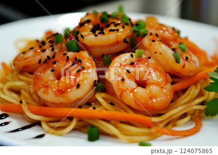 Shrimp and Noodles with Black Pepper Sauce and Colorful Vegetables