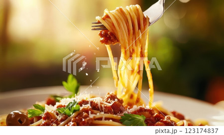 A fork lifts spaghetti Bolognese mid-air, with glistening sauce and falling Parmesan. Warm natural light and a sunlit window create a fresh, inviting Italian home-cooked atmosphere.