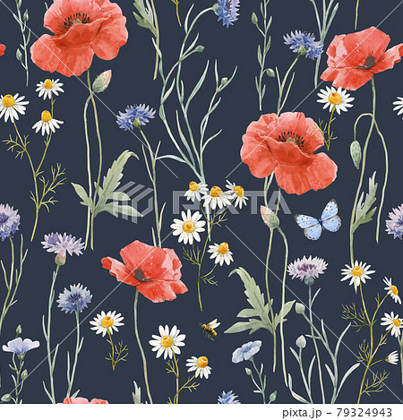 Beautiful seamless floral pattern with hand drawn watercolor gentle wild field flowers cornflower poppy. Stock illuistration.