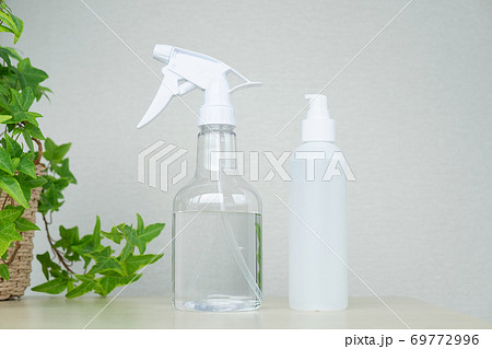 コロナウィルス予防のための消毒液、台の上に置かれている