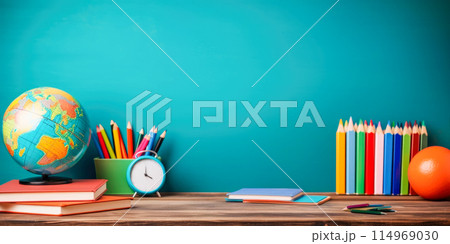 Empty frame border of school stationery supplies with alarm clock. Copy space for your text or Educational greeting announcement for students and teacher. Top view flat lay Creative vivid colorful