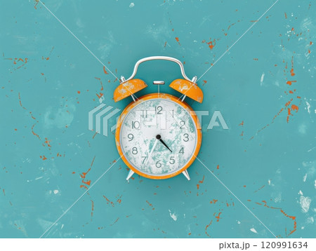 An orange alarm clock with white accents sits on a blue background, the hands pointing to the time.