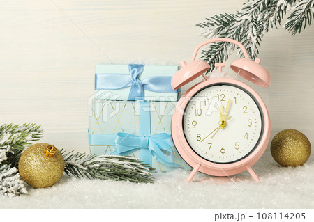 New Year's decor with a clock, top view.