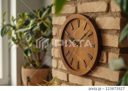 Stylish wooden wall clock hangs on a brick wall, adding a classic touch to a modern living space ambiance