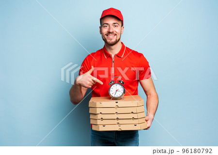 Deliveryman is punctual to deliver quickly pizzas. Cyan background