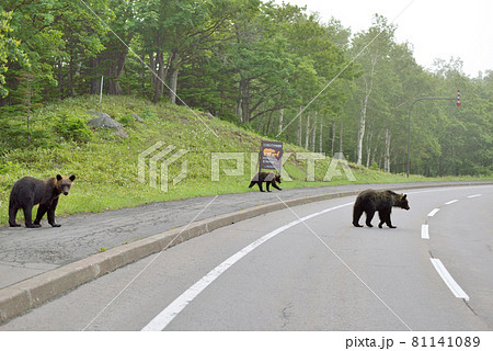 道路を悠然と横切るエゾヒグマ ヒグマ 羆