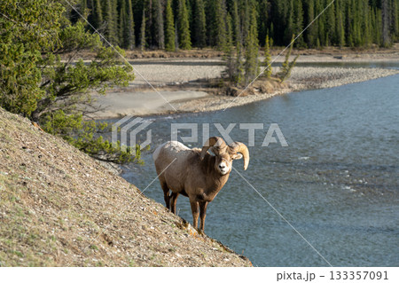 Canadian Rockies Jasper National Park nature scenery. Foraging bighorn sheep ram. Landscape background. Athabasca River, Whistlers Peak.