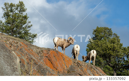 崖に立つ3頭のビッグホーンシープ(オオツノヒツジ)の雄。