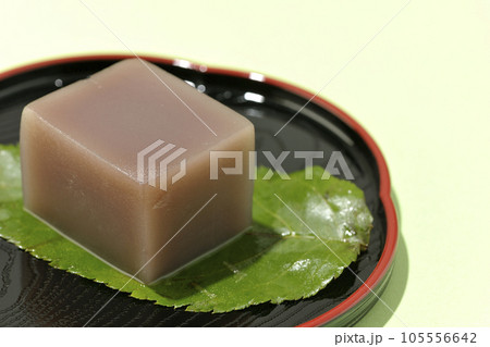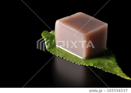 葉の上のサイコロ状の水羊羹を黒背景で撮影
