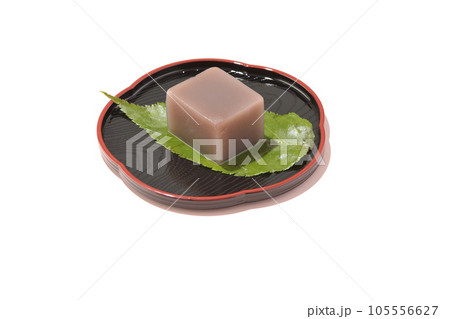 葉の上のサイコロ状の水羊羹を白背景で撮影
