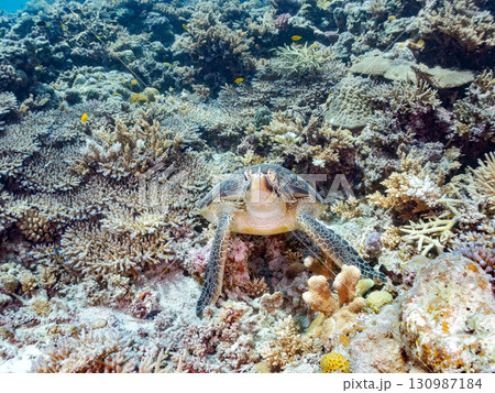 アオウミガメ。頭にウミウシを乗せていた。ダイバーもいる。美しいサンゴ礁と熱帯魚の群れ。 沖縄県島尻郡
