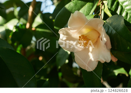 白椿の花を照らす木漏れ日・光と影の美しいコントラスト