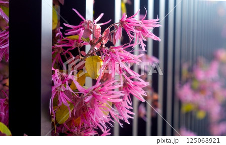 黒い門扉から咲きこぼれるトキワマンサクの花