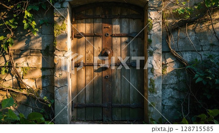 An ancient, weathered wooden door with heavy iron hardware set into a moss-covered stone wall, bathed in golden sunlight. Evokes mystery, history, and hidden secrets