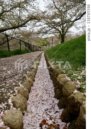 桜の花びらが散る葉桜の並木道・春の公園風景