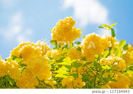 家の周りの草花 四季の色々 家の垣根に黄色い清楚なモッコウバラの花が青空に向かって咲きました