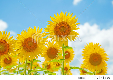 家の周りの草花 四季の色々 真夏の太陽に向かって咲く黄色い大輪のヒマワリ