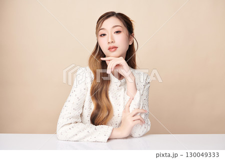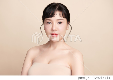 Beautiful young asian woman with clean fresh skin on beige background, Face care, Facial treatment, Cosmetology, beauty and spa, Asian women portrait.