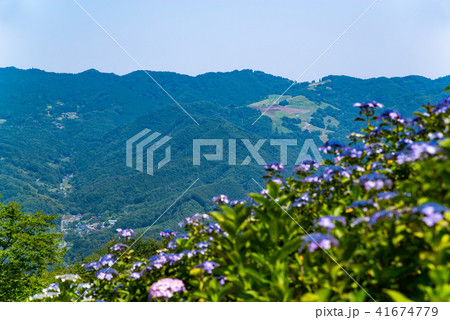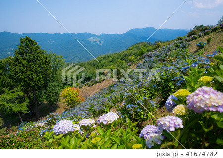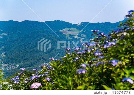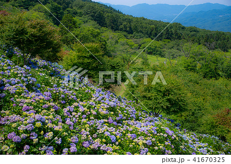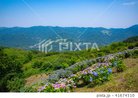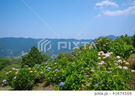 美の山 斜面のアジサイと緑と谷向こうの山影