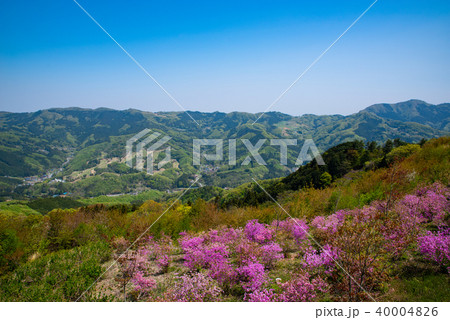 美の山 ツツジ咲く斜面から臨むの秩父高原牧場付近の山肌 d