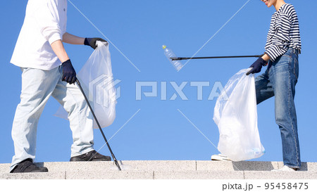 ゴミ拾いをする若い男女 ボランティア 清掃 イメージ