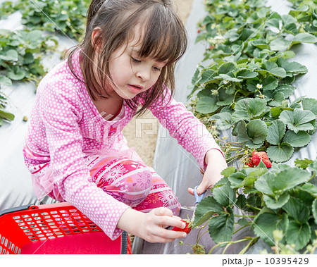 Pretty Young Girl Picking Fruit at Strawberry Farm