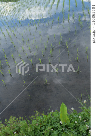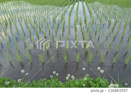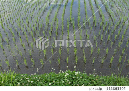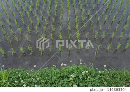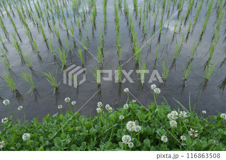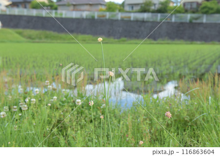 北杜市白州町の田植えの済んだ田んぼの畦道に咲く白詰草