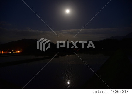 北杜市白州町、田植えの後の水田に映る月(横位置)