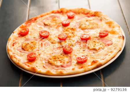 Top view of delicious pizza with ham, tomatoes, and olives