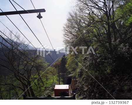 春の立山黒部アルペンルート 深緑に囲まれ立山ケーブルの下り線の車内より臨む