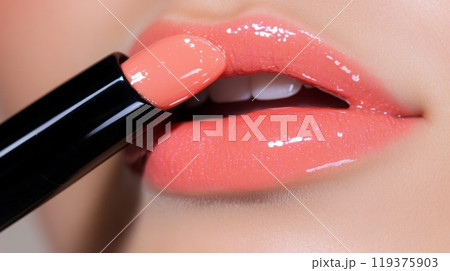 A close-up view shows a person applying a peach-colored lip product to enhance their lips. The shiny finish perfectly complements a spring beauty routine.