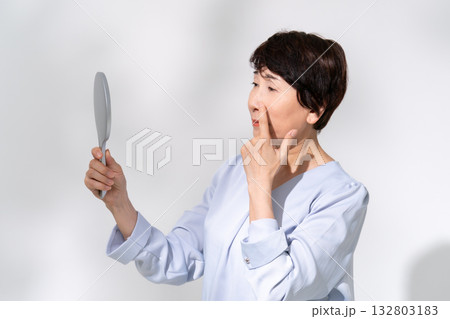鏡を見るシニア女性 悩む