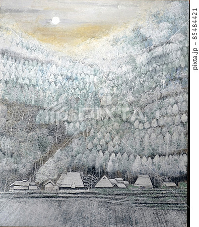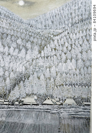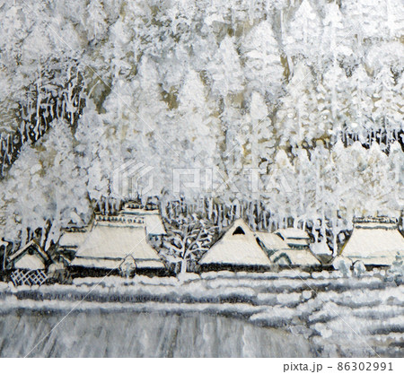 雪景色の水彩画 日本の民家 冬の風景
