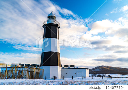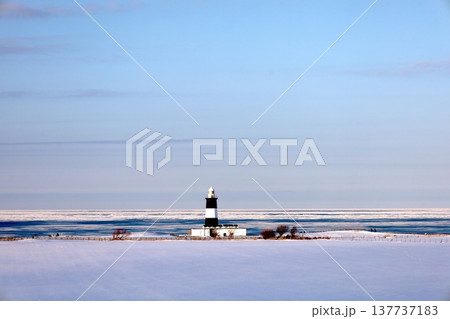 二月、極寒の冬の北海道、道東、網走、網走市、能取岬灯台で眺める流氷とサンセット、のとろ、アイヌ