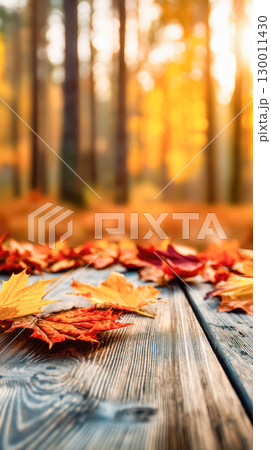 Colorful autumn leaves scattered on a rustic wooden table, with a blurred forest background showcasing warm seasonal hues and natural beauty