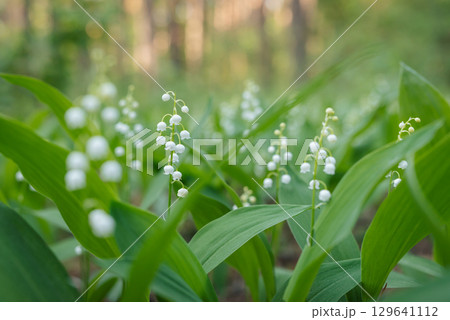 Close up of lily of the valley flowers in bloom in spring pine forest. Calm evening in forest, blooming lily of the valley in full bloom