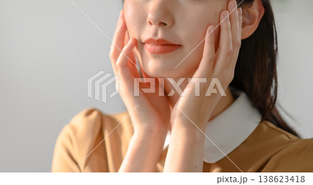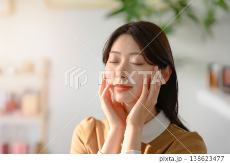 女性が頬に手を当ててスキンケアする様子