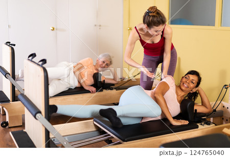 Middle-aged woman practicing pilates on pedal fitness chair in sports hall
