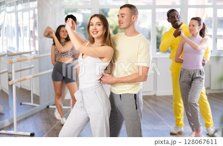 Group of men and women in festive clothes dancing foxtrot in dance studio