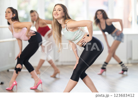 Group of modern women practicing high heels dance in studio