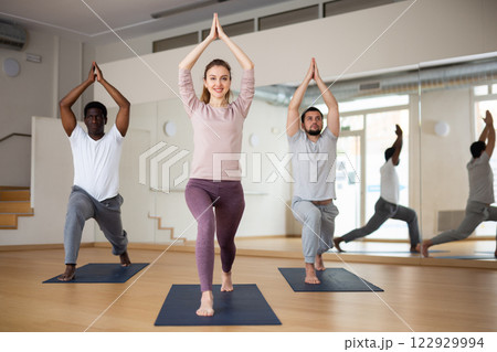 Young girl teaches yoga lesson, shows students technique of performing warrior pose asana