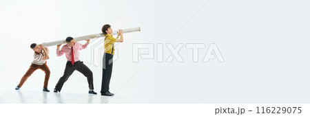 Three man in retro-style clothes carrying giant tube together isolated on white background, Teamwork, assistance and support of friends
