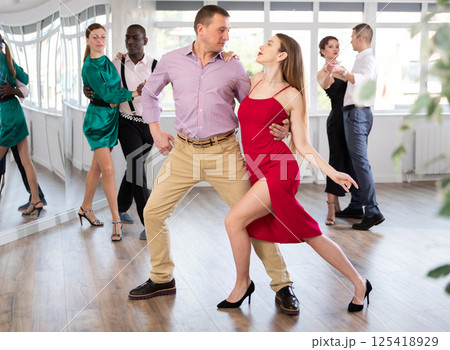 Dance training in group - men and women of different nationalities and different ages dance tango or bachata in dance studio