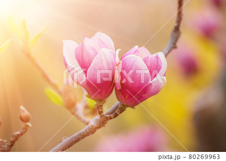 pink magnolia blossom in springtime. beautiful flowers on the branch in morning light