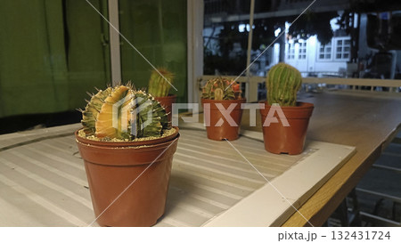 Variegated cactus potted cactus indoor plant terracotta pot wooden table night light home garden succulent care. Calm scene