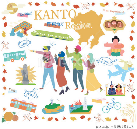 日本の関東地方の秋の名物観光を楽しむ観光客、アイコンのセット(フラット)